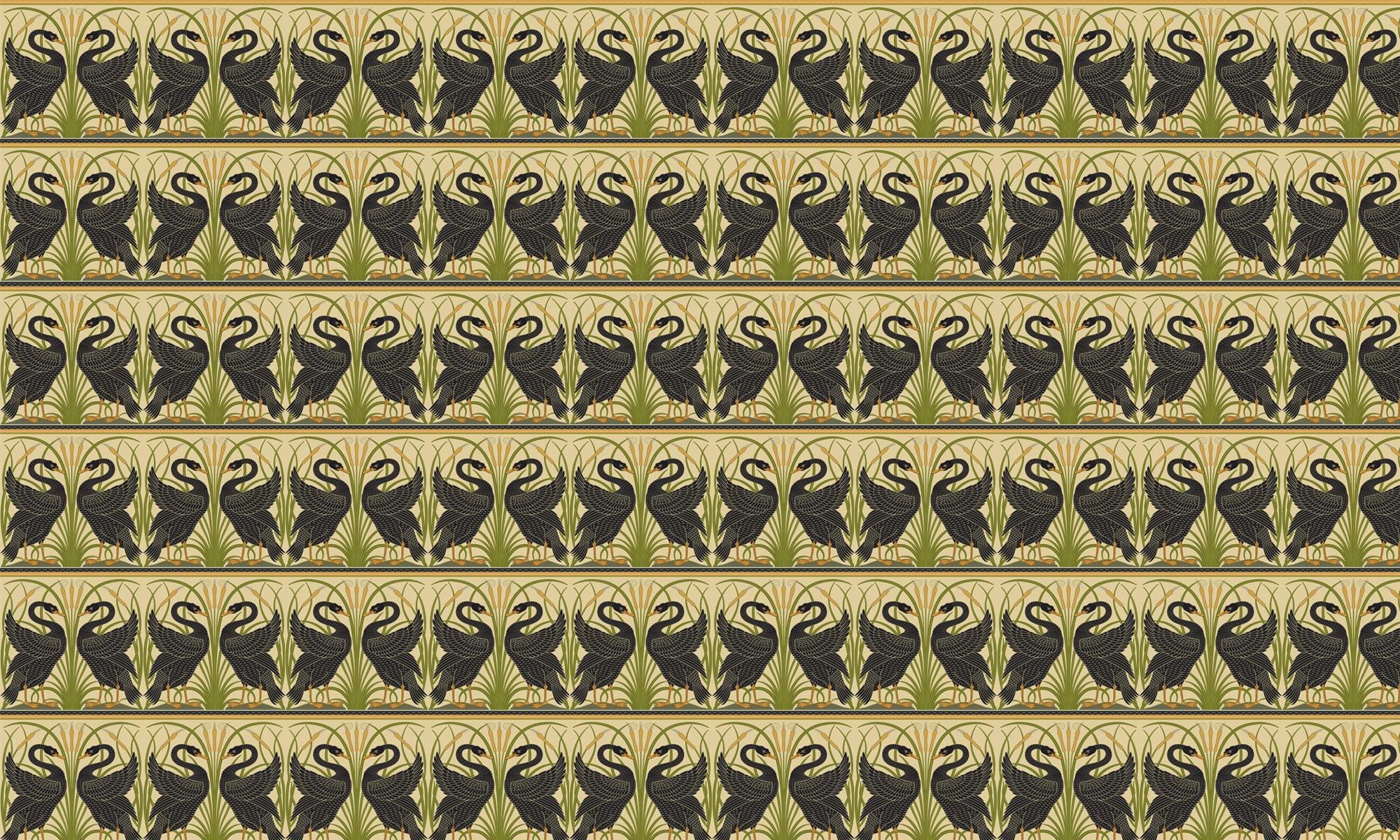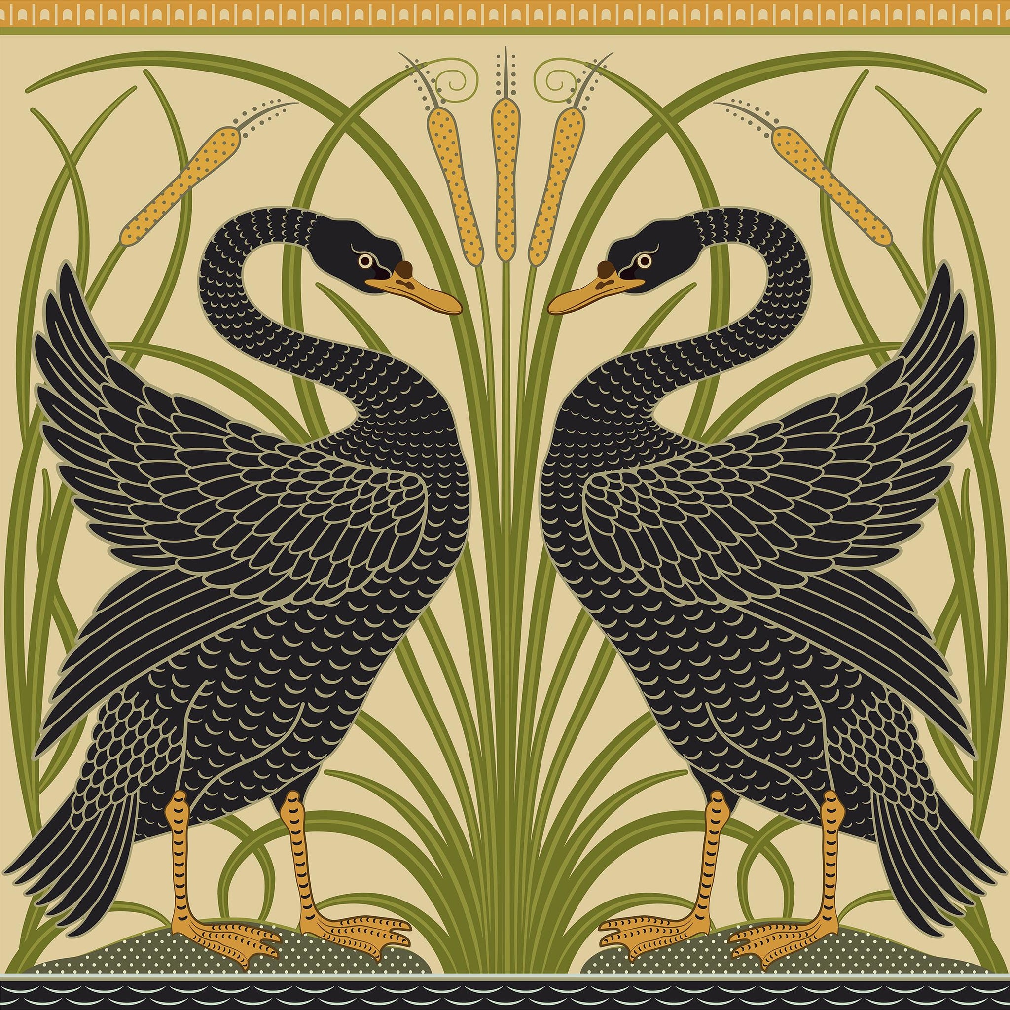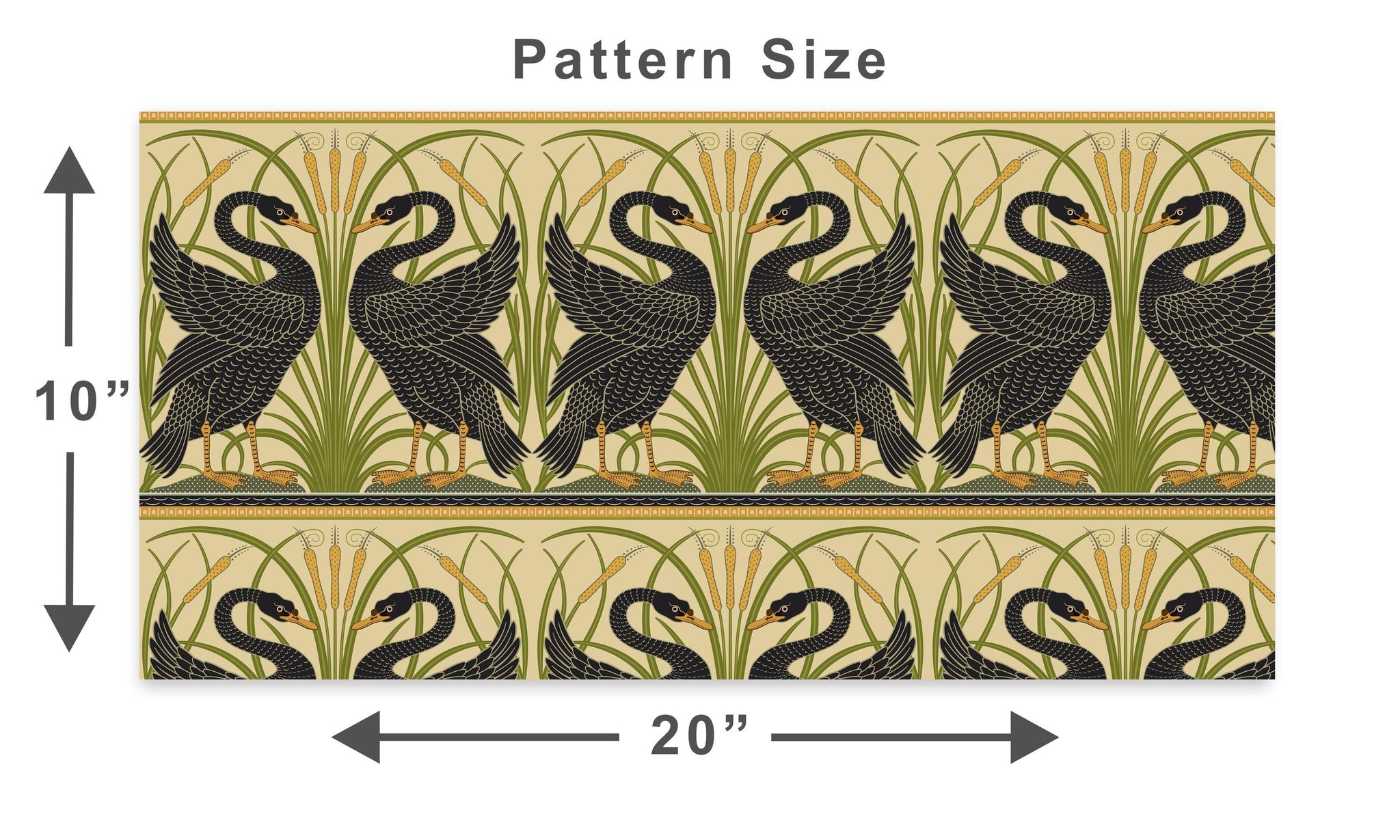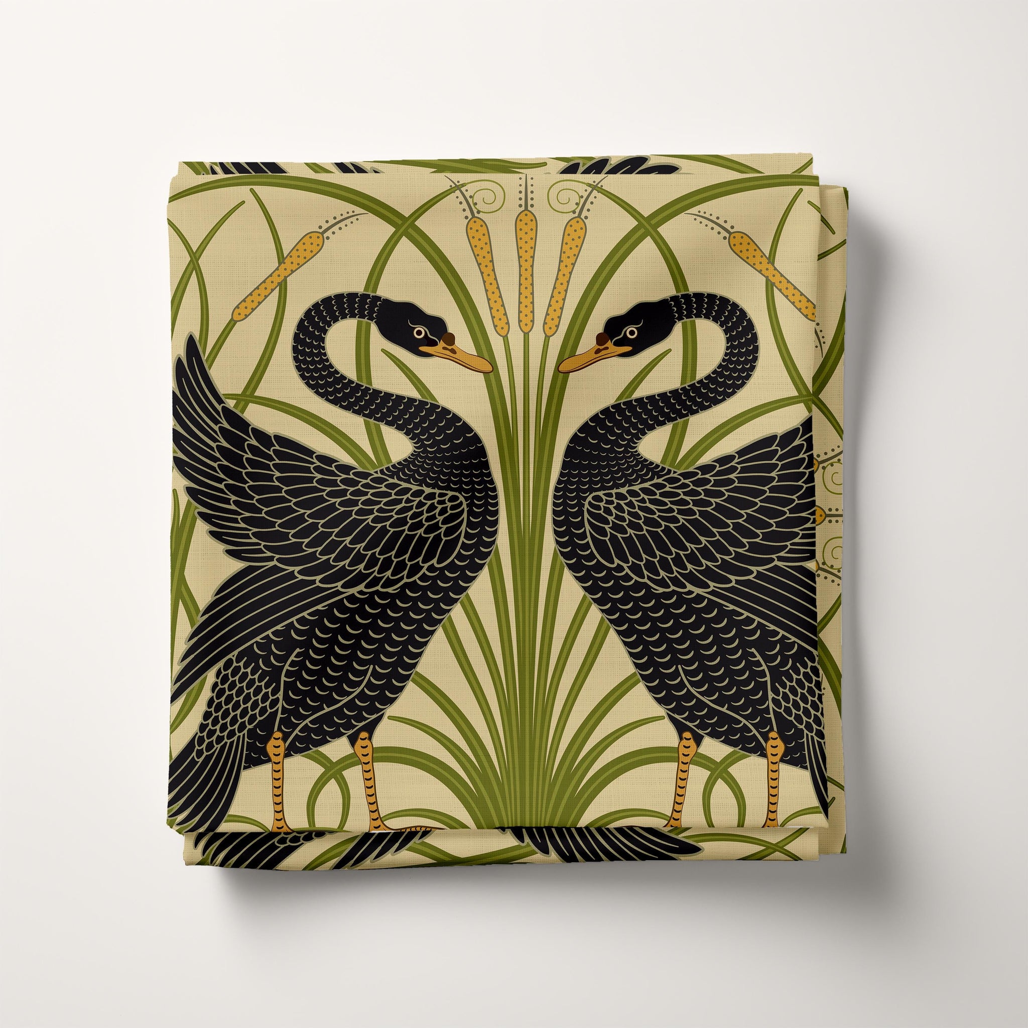 Elegant black swan fabric inspired by Art Nouveau design. Ornate textiles and upholstery material for vintage-inspired decorative interiors.