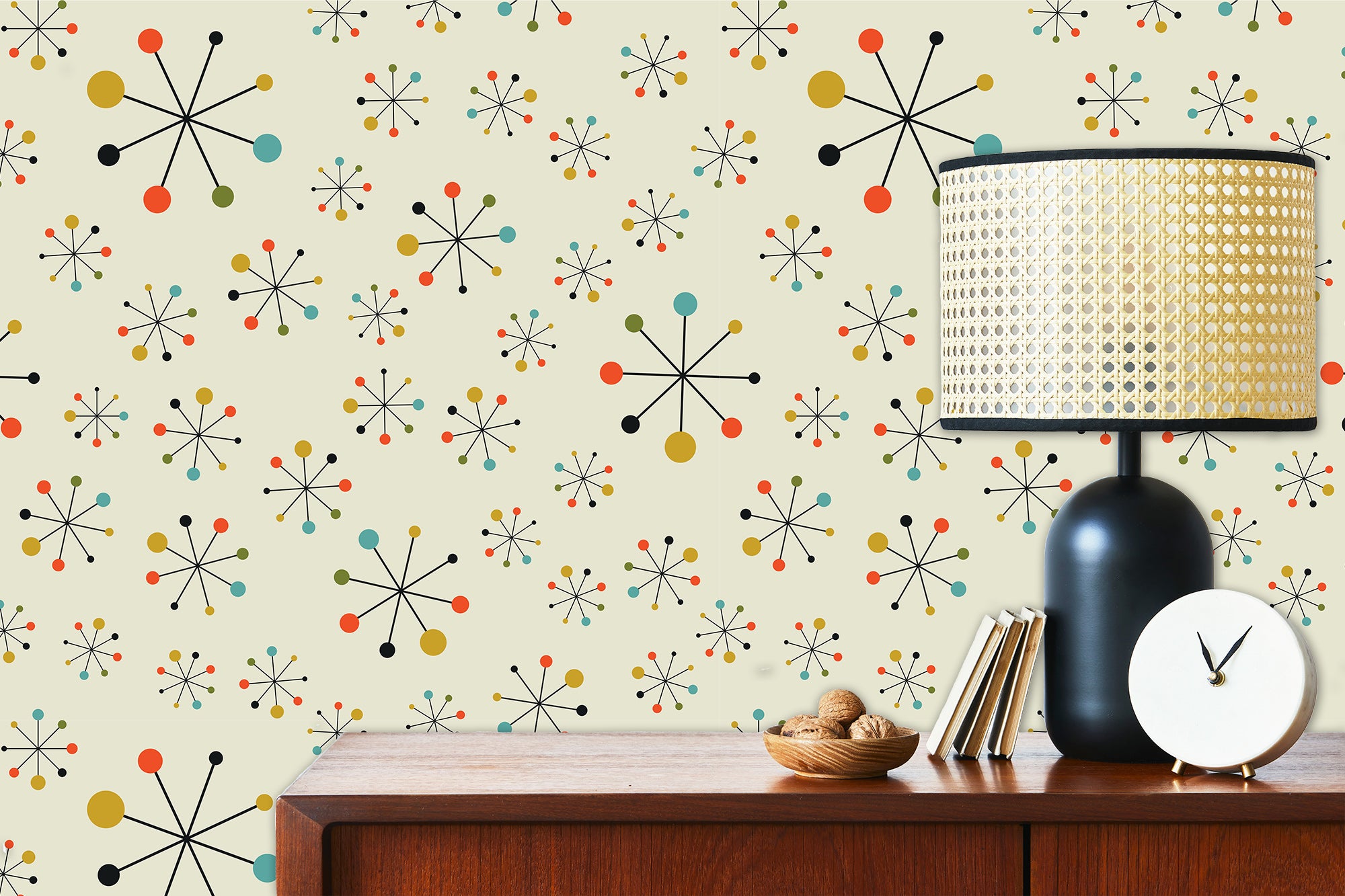 Antrim wallpaper features a playful mid-century modern starburst pattern in mustard, teal, olive, orange, and black on a soft neutral background. This retro atomic design adds bold personality and vintage charm to living rooms, offices, nurseries, and eclectic interiors. Perfect for modern, mod, and 1950s-inspired spaces.