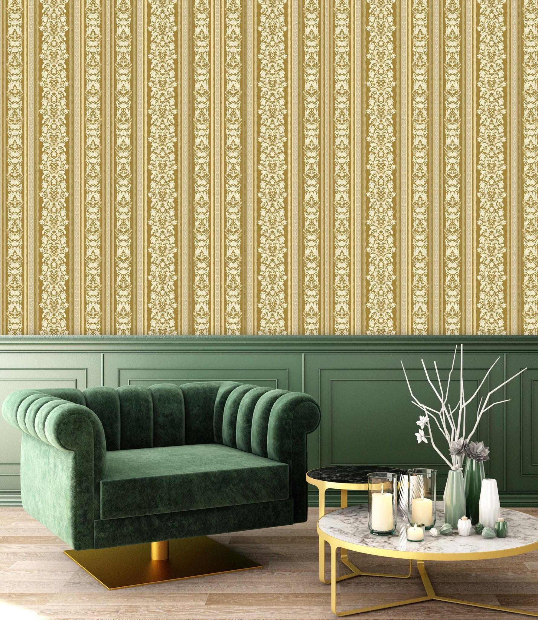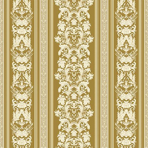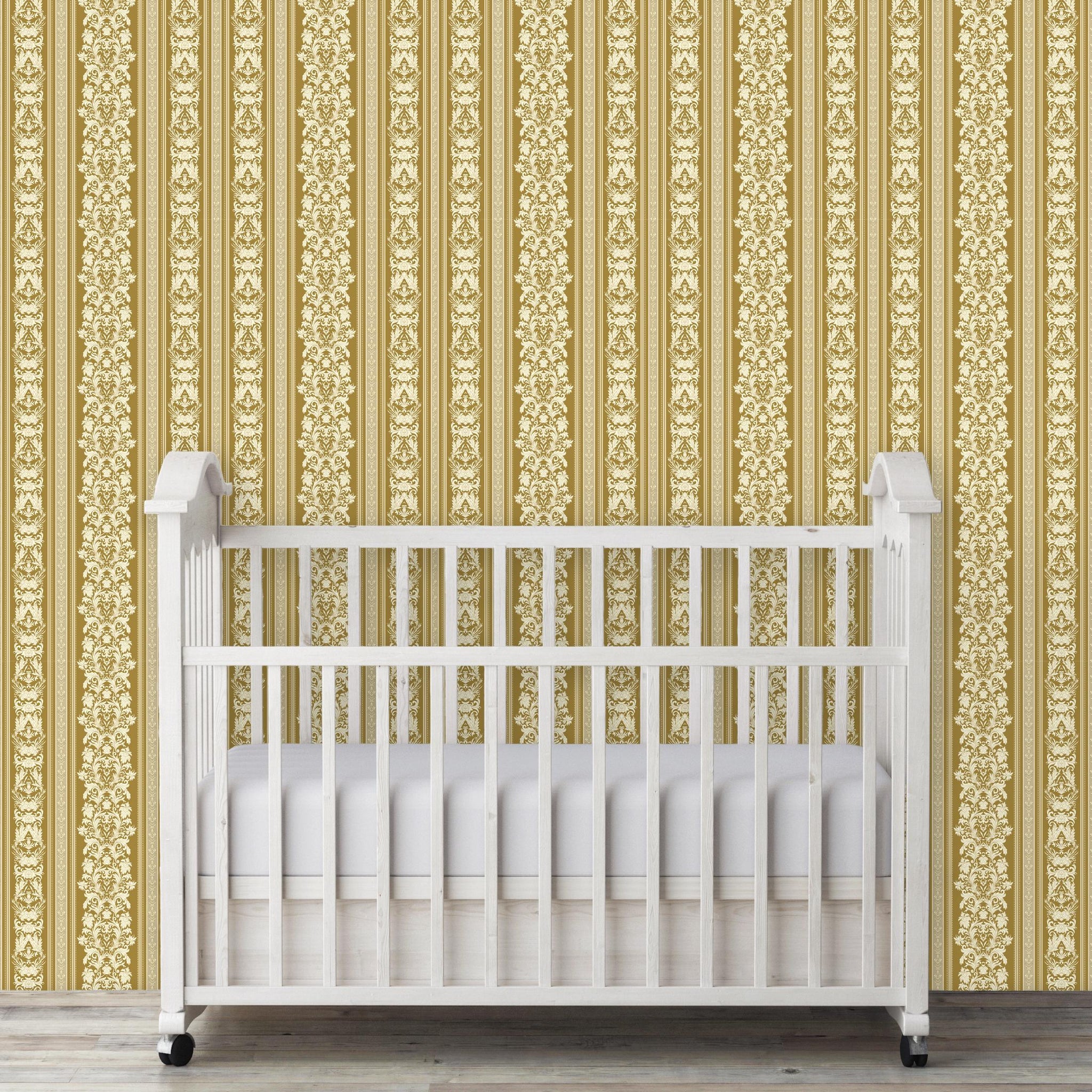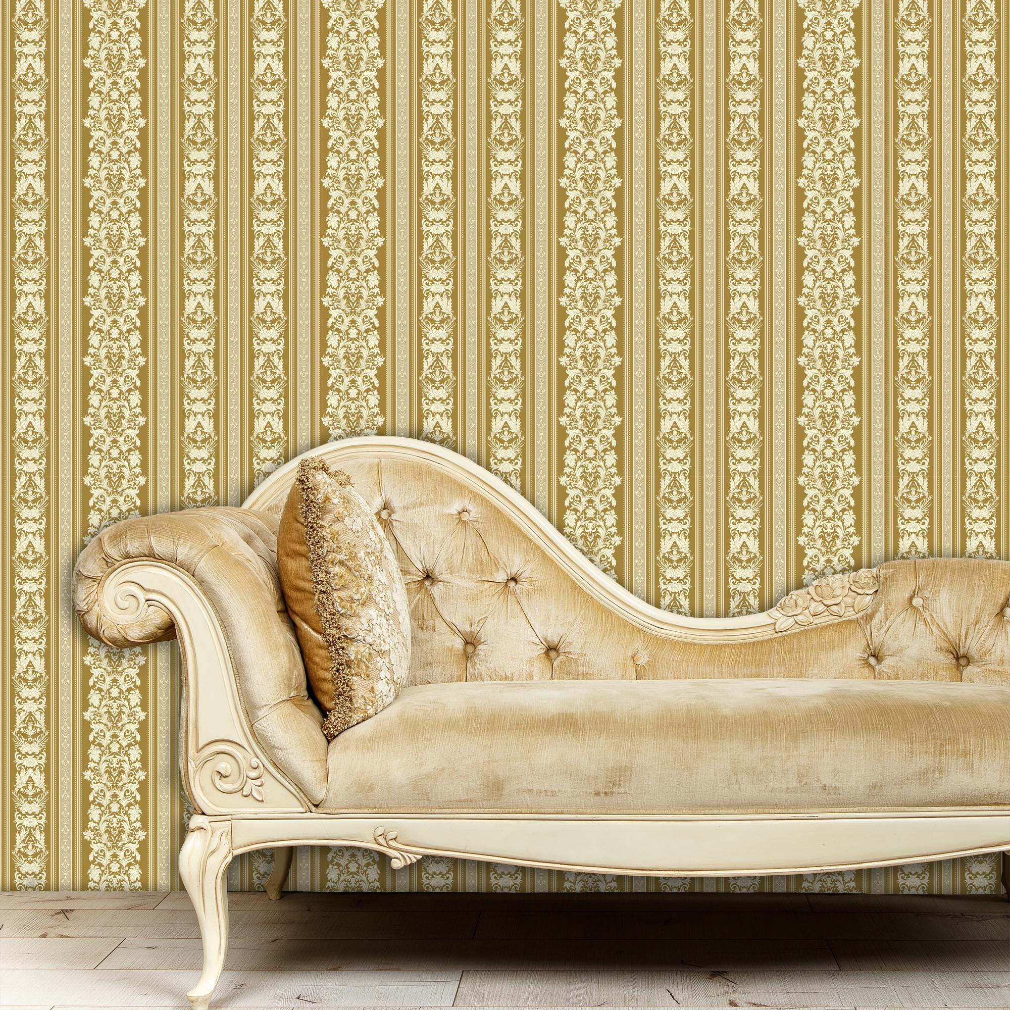 Klarice is a vintage-inspired Baroque stripe wallpaper in warm gold tones, featuring ornate damask detailing. Its graceful vertical layout brings a refined, historic charm to any room.