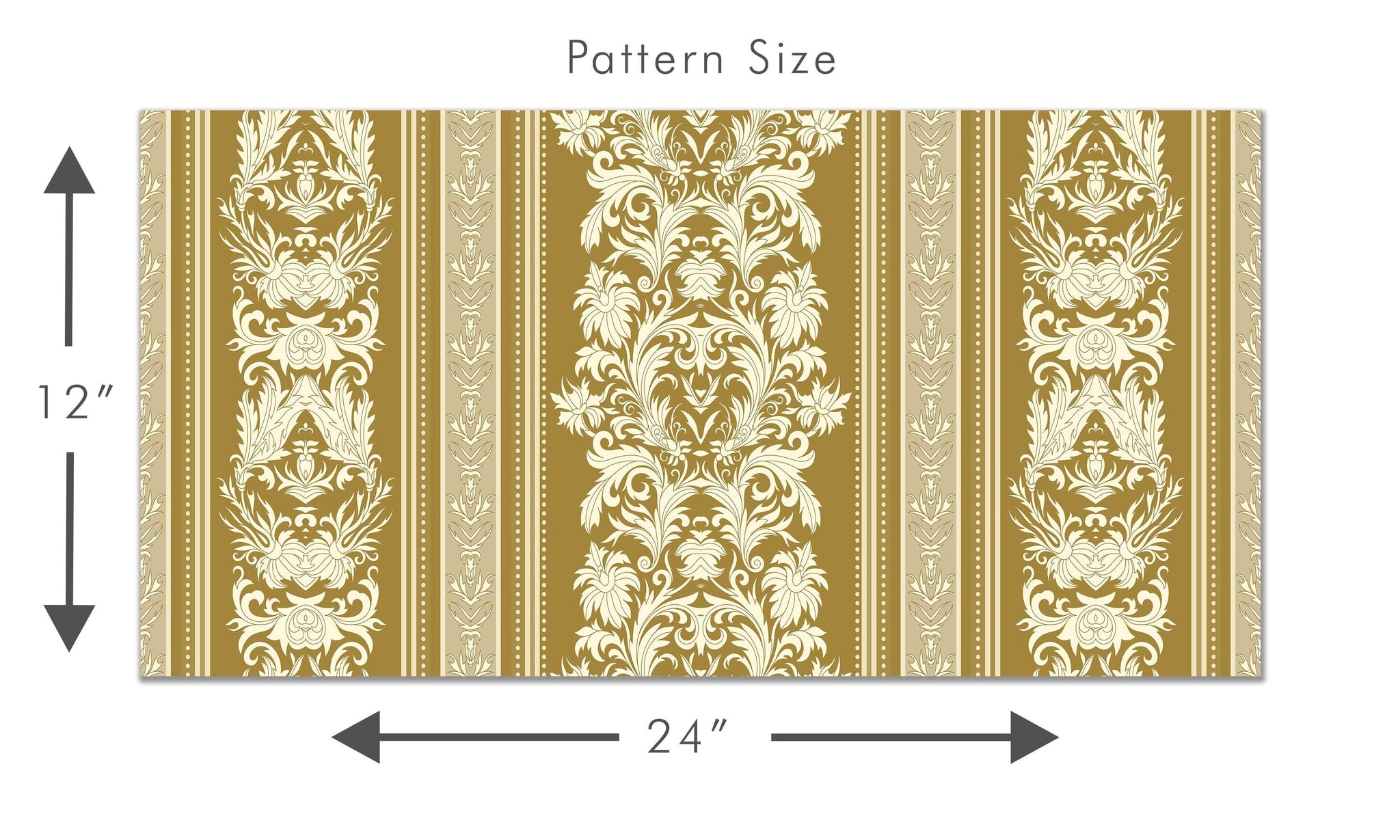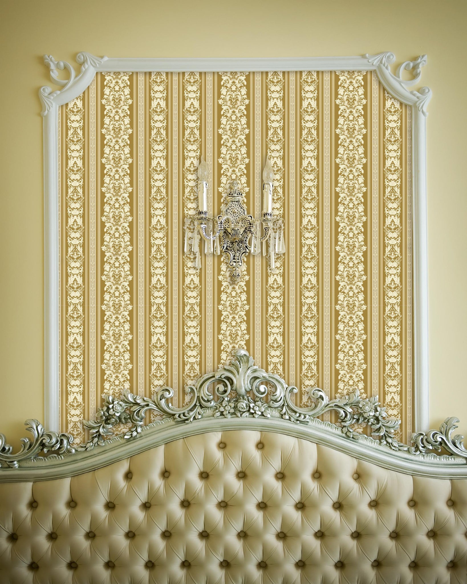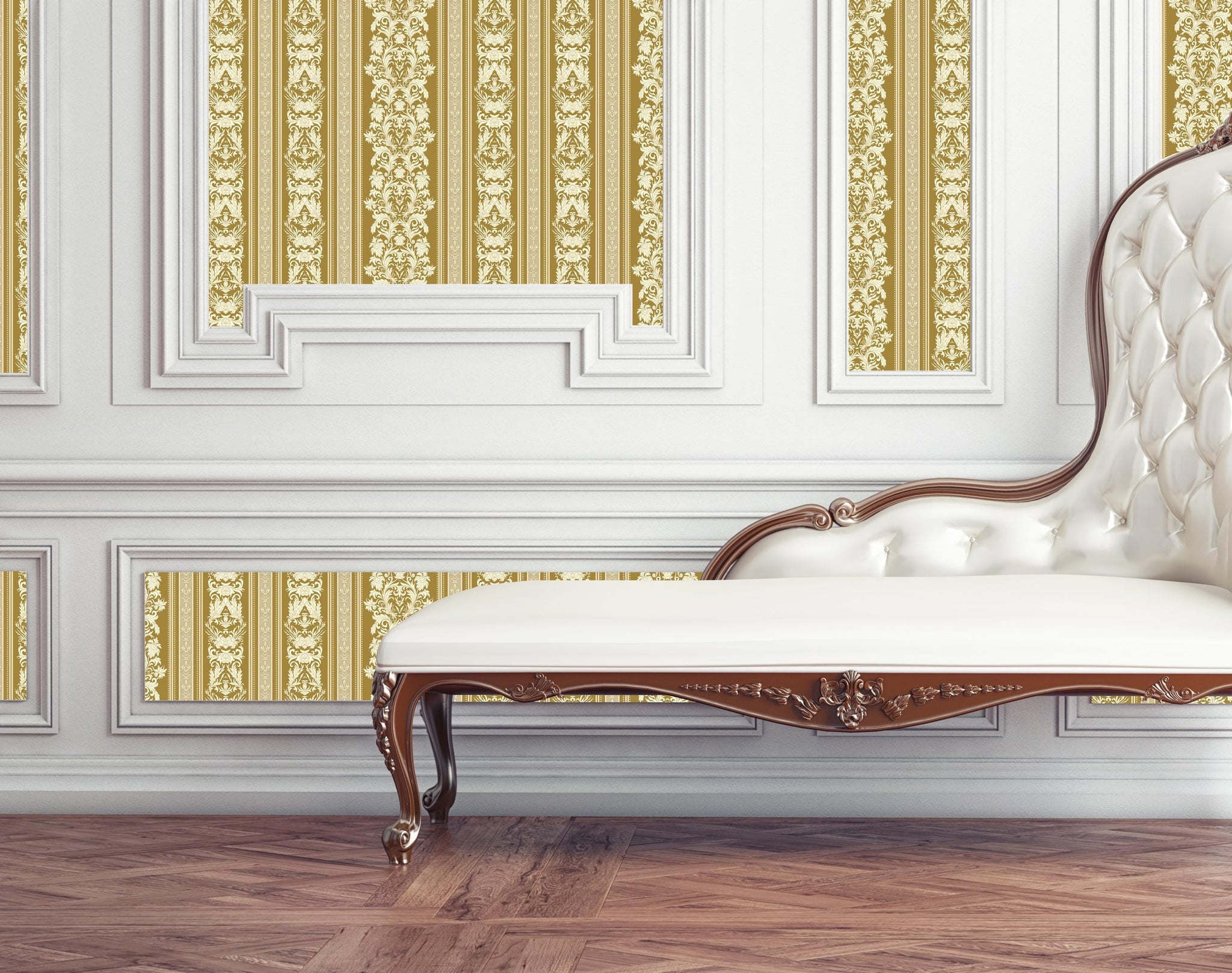 Klarice is a vintage-inspired Baroque stripe wallpaper in warm gold tones, featuring ornate damask detailing. Its graceful vertical layout brings a refined, historic charm to any room.